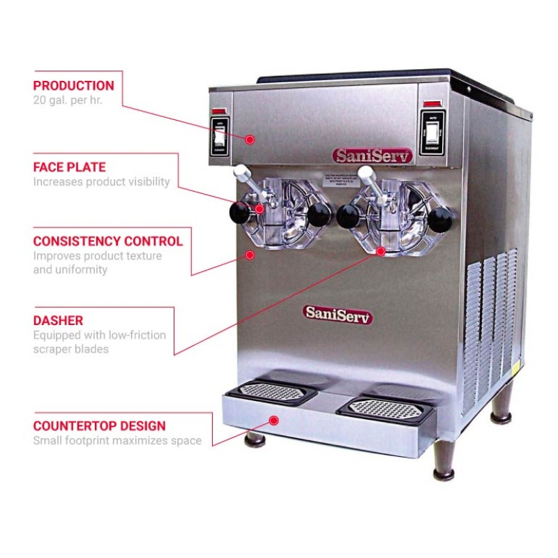 The SaniServ 791 frozen drink machine's exterior is constructed of stainless steel, which is durable and can be cleaned quickly. Made of steel, the interior frame adds strength to the unit. This machine is designed to sit on countertops, and it has a small footprint to maximize counterspace. It is equipped with heavy-duty stainless steel dashers that are fitted with low-friction scraper blades to ensure product is effectively mixed. Each of the sides has its own head for dispensing as much as 10 gallons of frozen cocktail per hour.