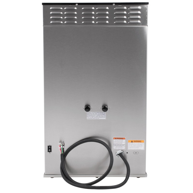 The Bunn 43100.0000 features a bilingual digital display in English and Spanish. A 3/8" male water connection and 120/240V electrical connection are required for operation. A cord and plug are not included.