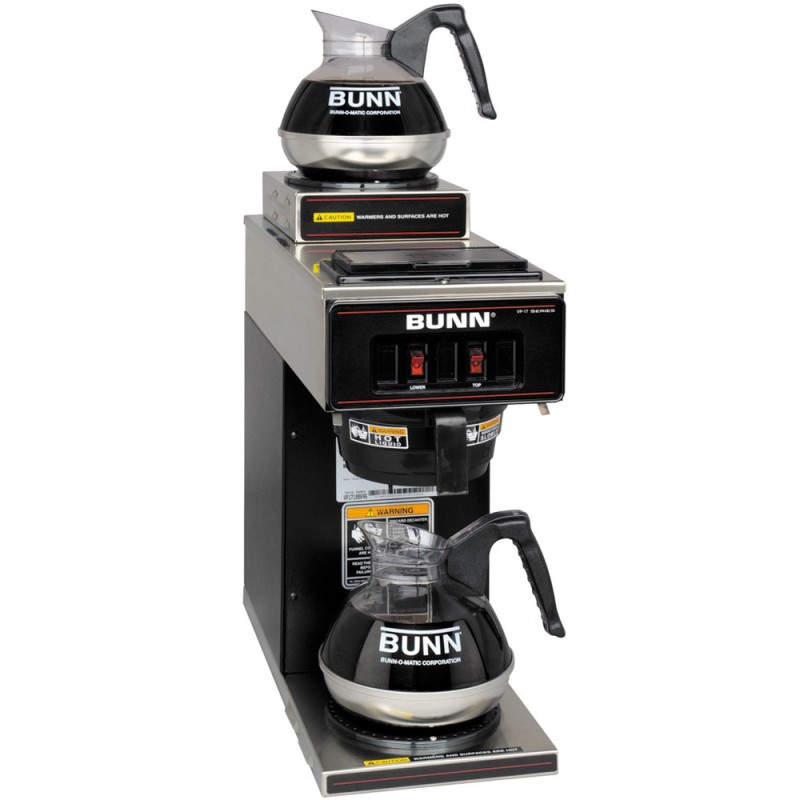 Brew up to 3.9 gallons of hot, fresh, and delicious coffee with the Bunn VP17-2 BLK 13300.0012 black low profile pourover coffee brewer! This coffee brewer features multiple warmers to keep up to two decanters of coffee hot and ready to serve, and it's capable of brewing enough coffee for up to 62 cups per hour. The SplashGard funnel keeps hot liquid from the operator's hands, and the stainless steel construction provides outstanding durability and longevity. And thanks to its narrow footprint, this coffee brewer can fit in areas where space is at a premium, and its pourover design makes it conveniently portable.