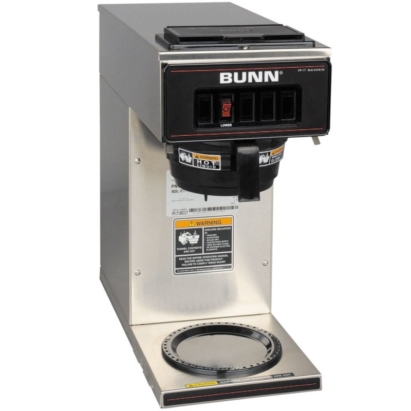 The Bunn VP17-1 can brew up to 3.8 gallons per hour directly into standard 64 oz. decanters. Its stainless steel exterior allows for quick, easy clean up and a black plastic SplashGard funnel protects the user from burns.