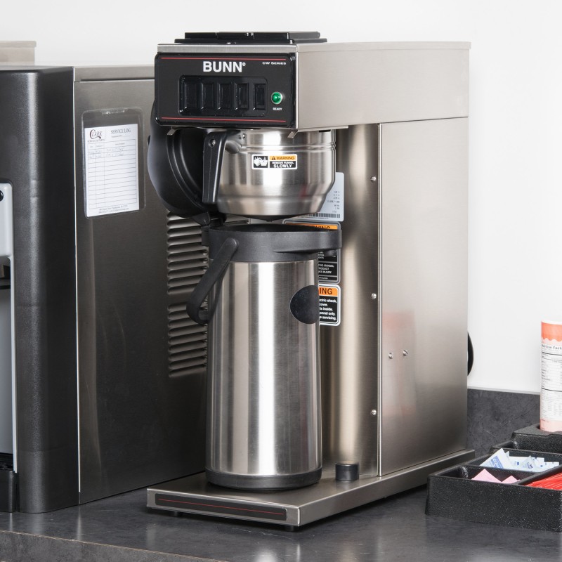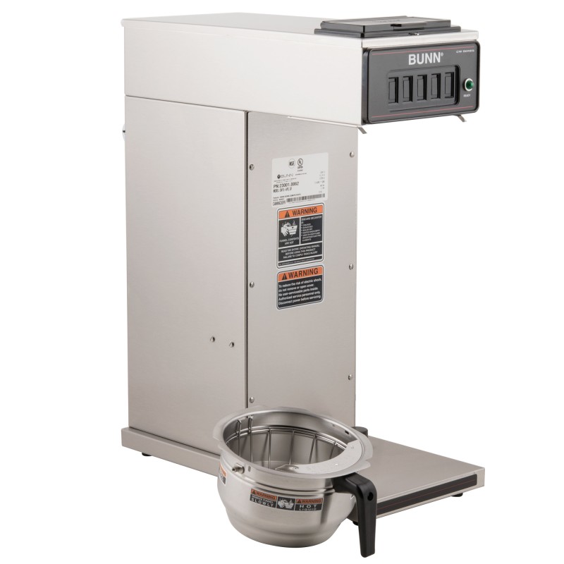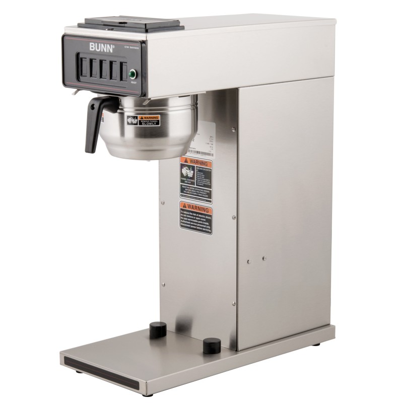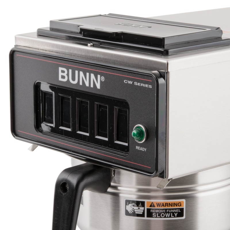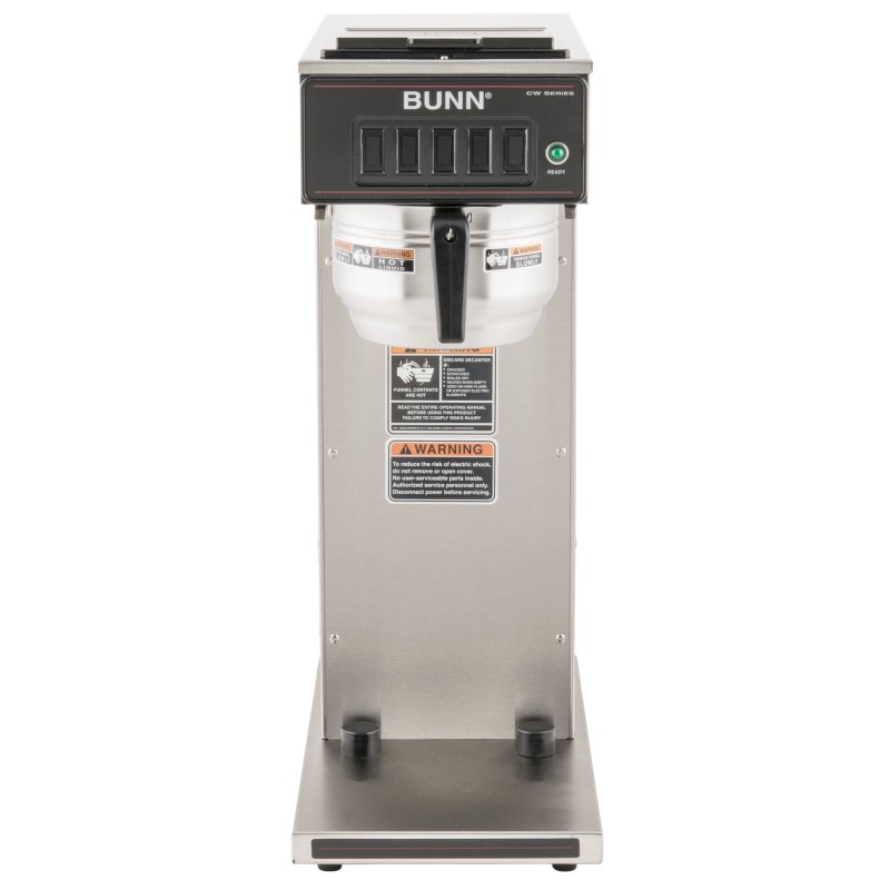 The Bunn CW15-APS pourover airpot brewer can brew up to 3.8 gallons of delicious, rich coffee per hour directly into airpots up to 17 1/2" tall. Its extra-deep gourmet funnel is ideal for robust flavors and mixed blends. Hot water takes longer to pour through the grounds in the gourmet funnel, which allows the water to extract more robust coffee flavor than a standard depth funnel.