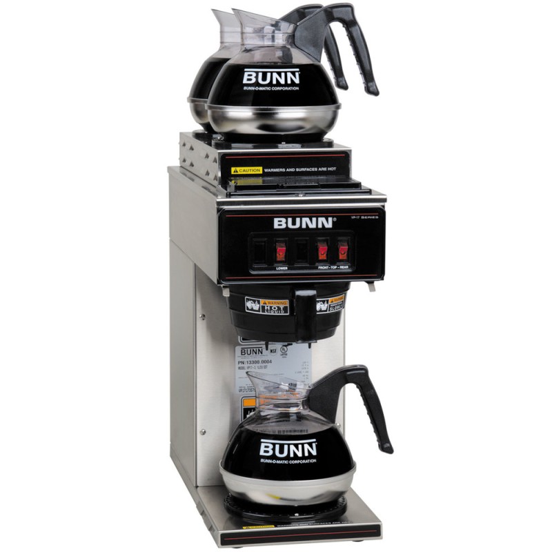 Brew up to 3.8 gallons of hot, fresh, and delicious coffee with the Bunn VP17-3 13300.0004 low profile pourover coffee brewer! This coffee brewer features multiple warmers to keep up to three decanters of coffee hot and ready to serve, and it's capable of brewing enough coffee for up to 60 cups per hour. The SplashGard funnel keeps hot liquid from the operator's hands, and the stainless steel construction provides outstanding durability and longevity. And thanks to its narrow footprint, this coffee brewer can fit in areas where space is at a premium, and its pourover design makes it conveniently portable.