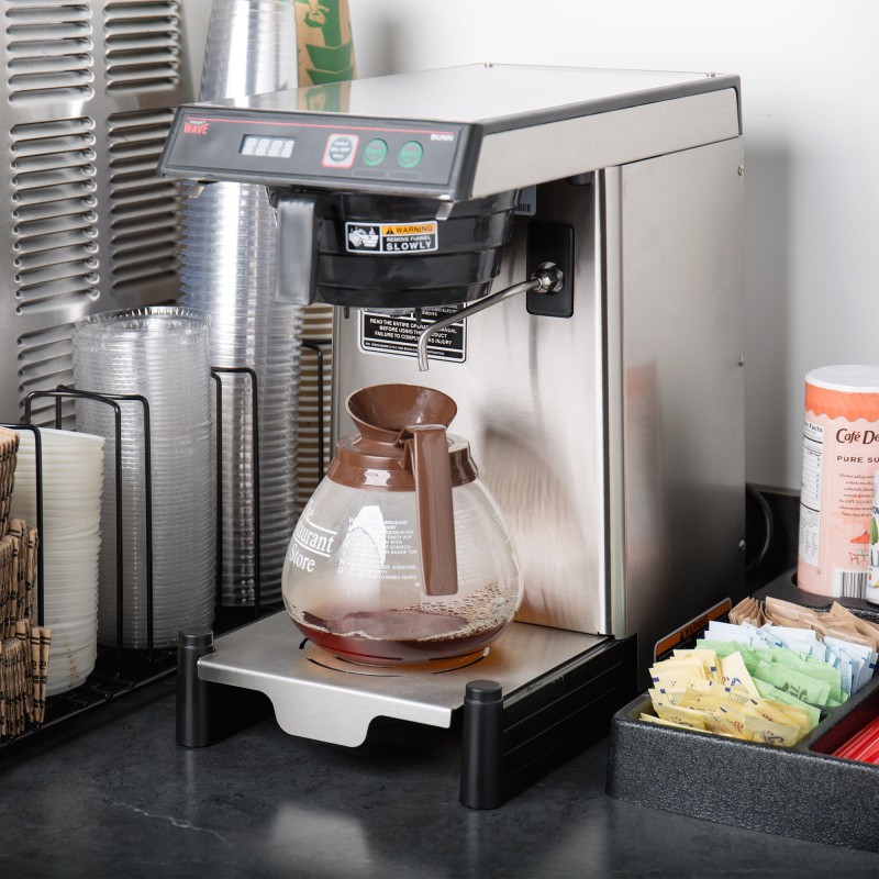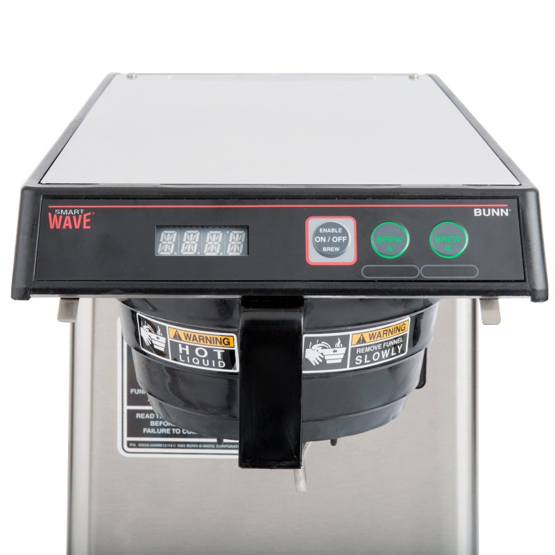 Brew up to 62 8 oz. cups of coffee or tea with this Bunn 39900.0020 SmartWAVE coffee and tea brewer. This machine is perfect for offices and small business environments. It features a low profile design to save important counter space, but can handle 3 liter lever-action airpots and 2.5 liter push button airpots, offering great flexibility. This machine even includes a slide-out booster tray to accommodate smaller 1.9 liter thermal carafes. Cold brew lock out capability prevents brewing when the water temperature is below the correct brewing temperature to preserve proper quality, while easy-to-read digital displays allow for simple, accurate programming.