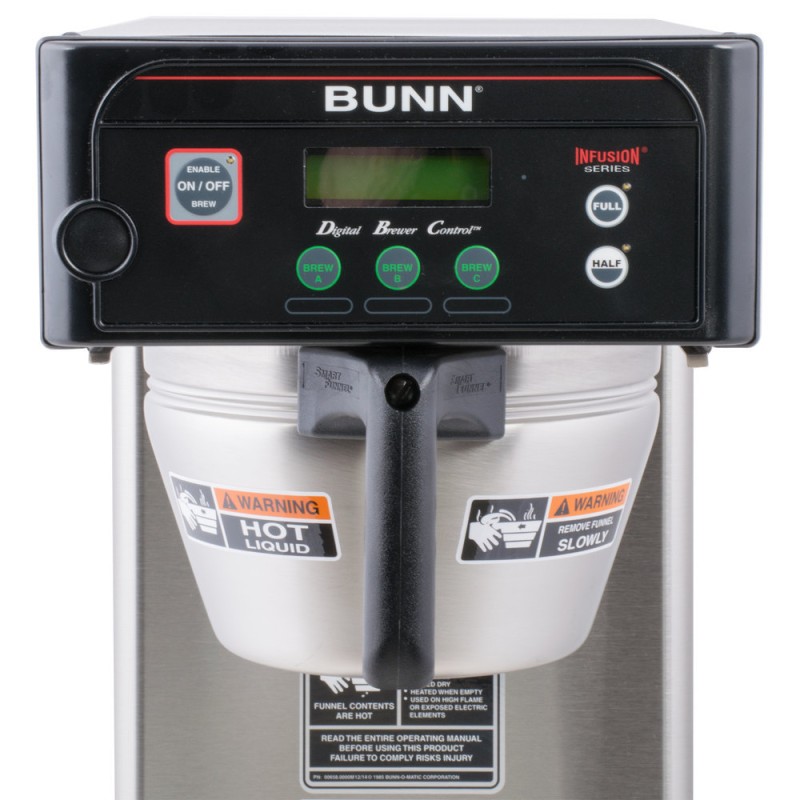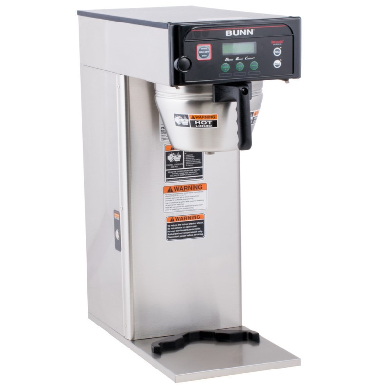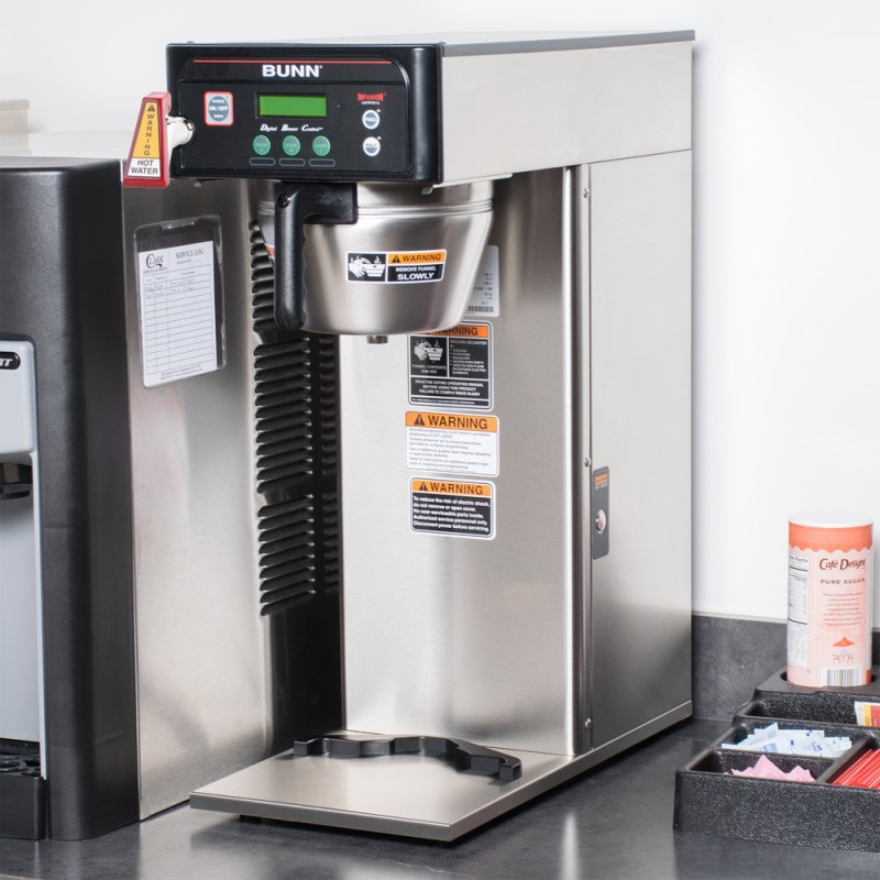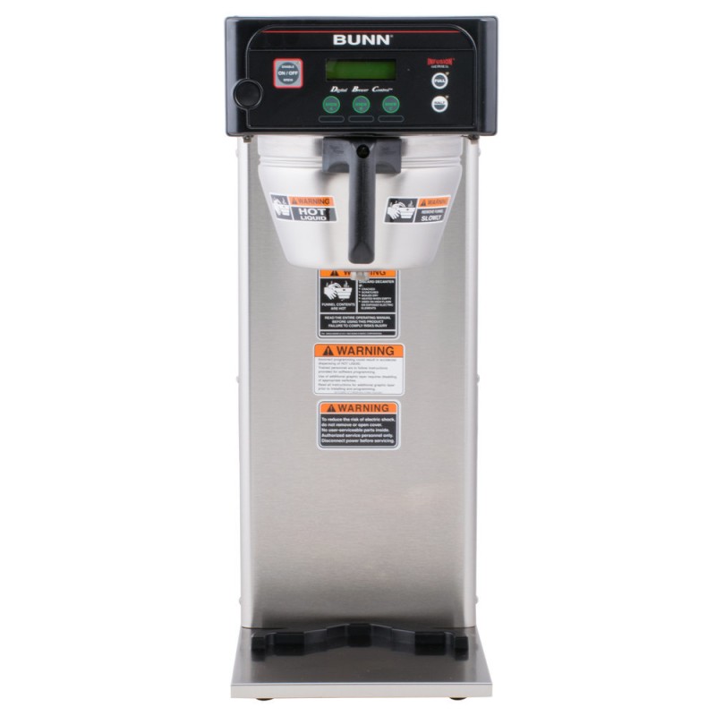 The Bunn ICB-DV Infusion single brewer can brew directly into 2.5 to 3.8L Bunn airpots or 1 to 1.5 gallon Bunn Thermofresh baseless servers. Three brew buttons allow you to pre-program three separate brewing profiles, and two programmable batch switches give you the option of brewing in full or half size batches. This brewer features an easy to use digital display in English and Spanish for easy use and programming, and it also comes with an overlay kit so you can customize the brewer interface to fit your specific needs.