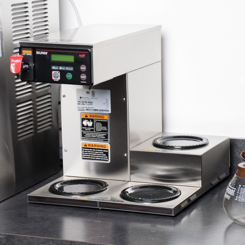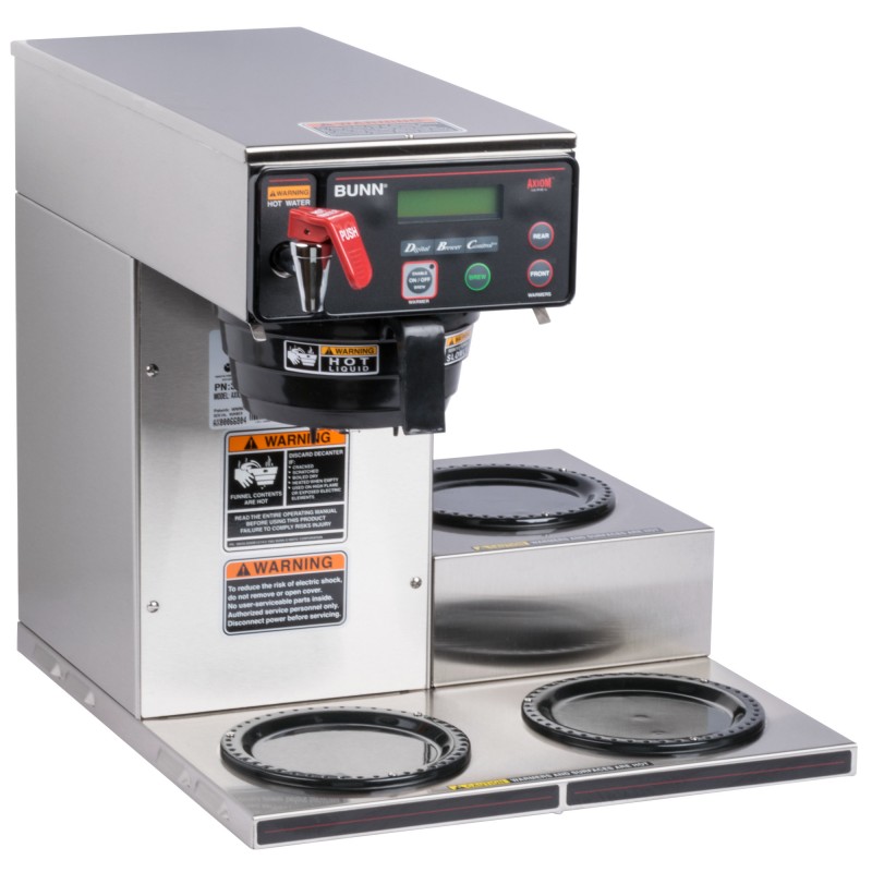 This Bunn Axiom 15-3 automatic coffee brewer features simple, programmable digital controls and an LCD display. Its control system allows you to set brew levels, tank temperature, and pulse settings quickly and easily from the front of the brewer. This reliable machine has room to hold three decanters (sold separately) of coffee at once to ensure you always have a supply of hot coffee for your customers.