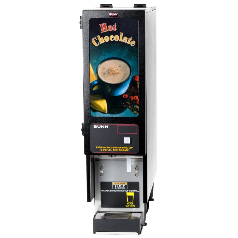 This Bunn FMD-1 BLK Fresh Mix cappuccino, espresso, and hot chocolate dispenser has a colorful, lighted display and one, 8 lb. hopper. The bright, hot chocolate display graphic beckons customers to self service stations at your convenience store, coffee shop, or cafeteria style restaurant!