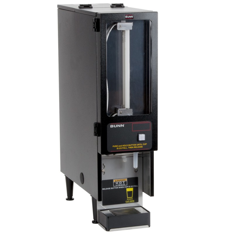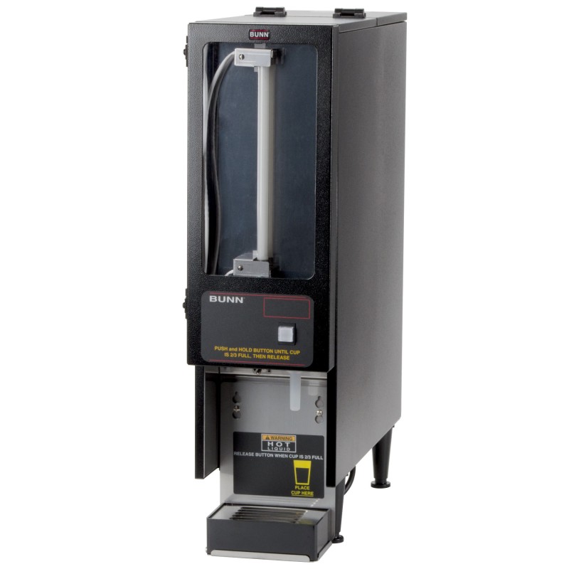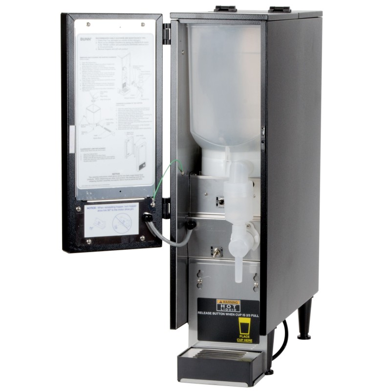 The Bunn FMD-1 BLK Fresh Mix cappuccino machine / espresso machine hot chocolate dispenser features a large hot water reservoir that provides a serving capacity of up to 4.2 gallons per hour. Its translucent, easy-to-fill hopper ensures quick and timely refilling as needed. Adjustable legs and a drip tray can be configured to accommodate cups up to 7" tall.
