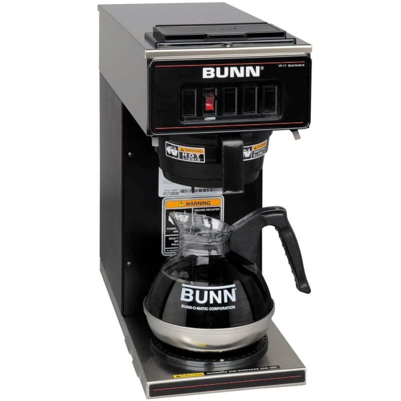The Bunn VP17-1 BLK pourover coffee brewer can brew up to 3.8 gallons per hour directly into standard 64 oz. decanters. Its stainless steel exterior with a black finish allows for quick, easy clean up and a black plastic SplashGuard funnel protects the user from burns.