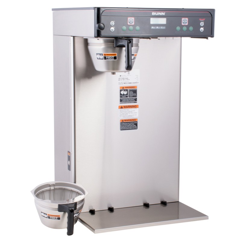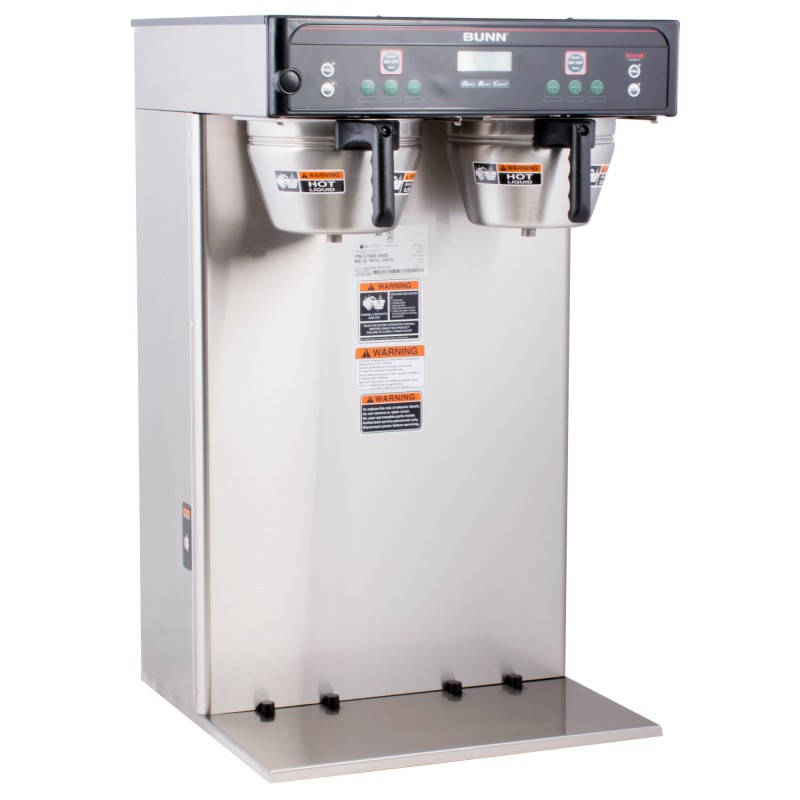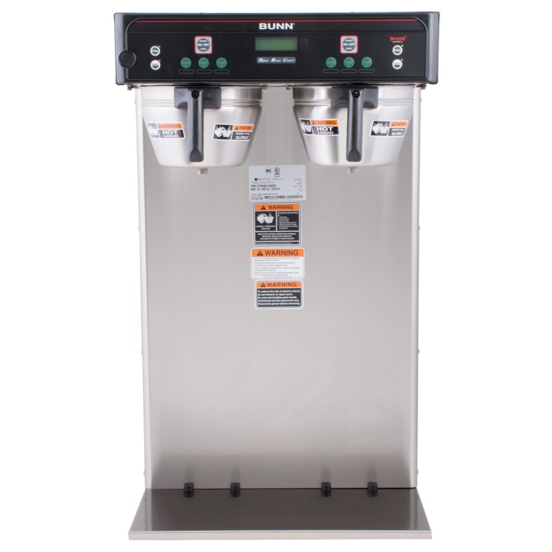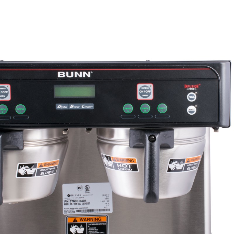 Brew and dispense your signature coffee with the Bunn ICB-TWIN Tall dual infusion series coffee brewer! This brewer can make up to 17.5 gallons of coffee per hour to keep up with your busiest days, and its 5.6 gallon tank provides a constant source of hot water. Each side to this dual brewer has three brew buttons to specify three separate brewing profiles, while two programmable batch switches offer full and half batch brewing options. It's compatible with 2.5 to 3.8 liter airpots and 3.8 to 5.7 liter baseless ThermoFresh servers for versatility, convenience, and transportation.
