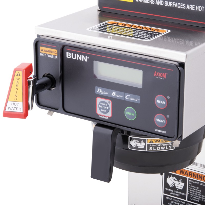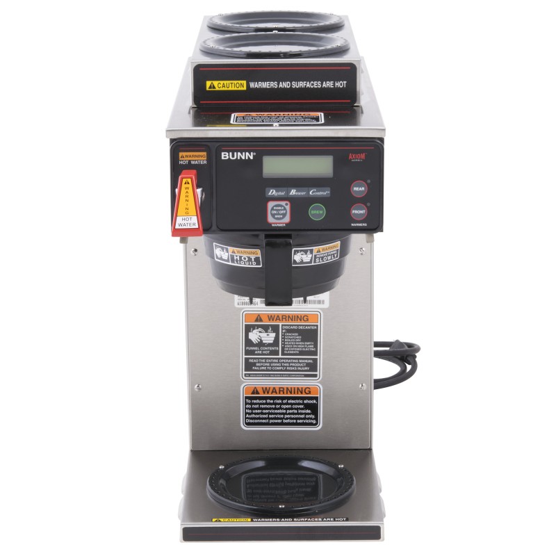 This Bunn Axiom DV-3 automatic coffee brewer with 1 lower and 2 upper warmers features simple, programmable digital controls and an LCD display. Its control system allows you to set brew levels, tank temperature, and pulse settings quickly and easily from the front of the brewer.