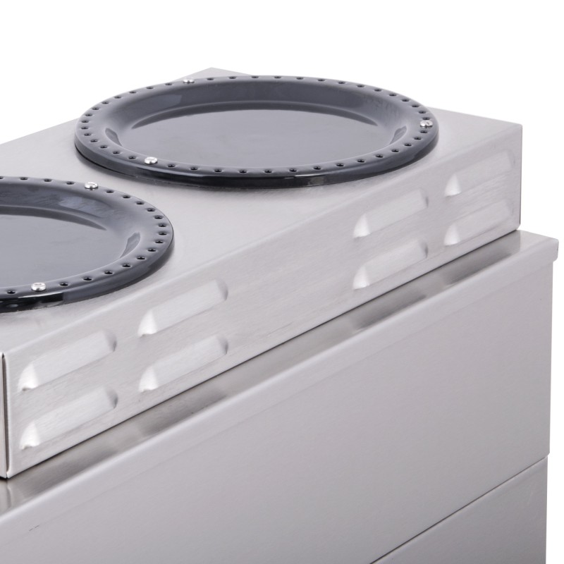 An energy saver mode and automatic warmer shut off help reduce energy consumption during idle periods. A stainless steel exterior, electronic diagnostics, and a built-in tank drain make clean up and service quick and easy. Additionally, a unique SplashGard funnel deflects hot liquids away from the hand to prevent burns.