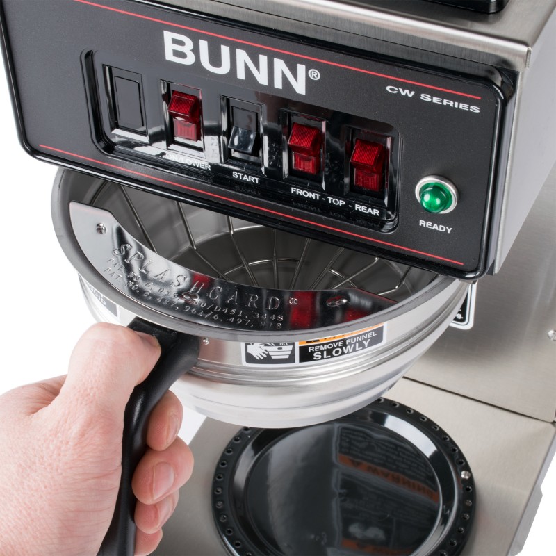The Bunn CWT15 automatic 12 cup coffee brewer also features a pourover back up system. Its stainless steel exterior and SplashGard stainless steel funnel ensure quick, easy clean up and protect the user from burns.The unit has a 120V, 13.9 amp, and 1670 watt electrical rating.