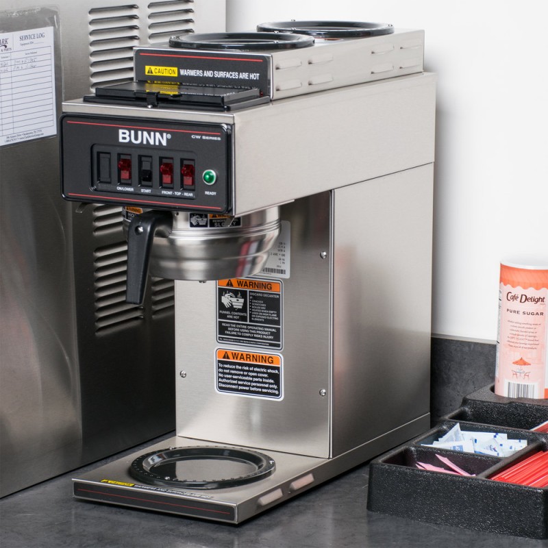 The Bunn CWT15 automatic 12 cup coffee brewer with 2 upper and 1 lower warmer can brew up to 3.9 gallons per hour into standard, 64 oz. decanters. Its compact footprint, only 8 1/2" wide, makes the Bunn CWT15 automatic coffee brewer a great addition to family restaurants, cafes, or diners with limited countertop space.