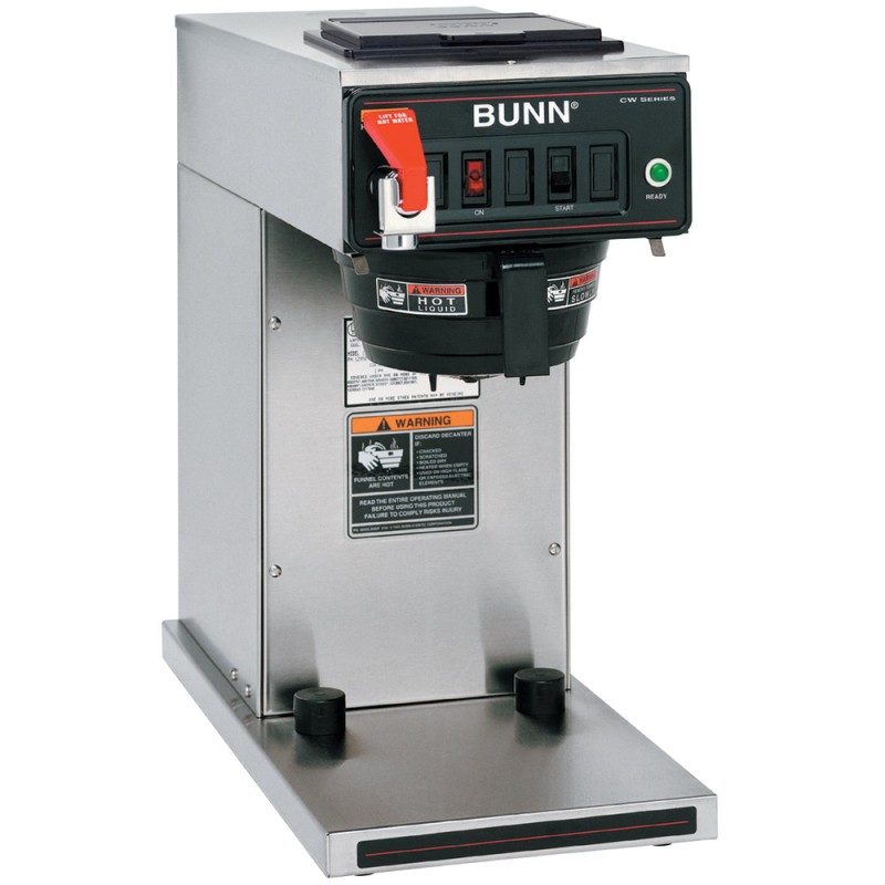 The Bunn CWTF15 TC thermal carafe coffee brewer has a black plastic funnel that provides enough clearance to accommodate up to 8 1/2" tall thermal carafes, sold separately. The unit has a 120V, 11.4 amp, 1370 watt electrical rating.