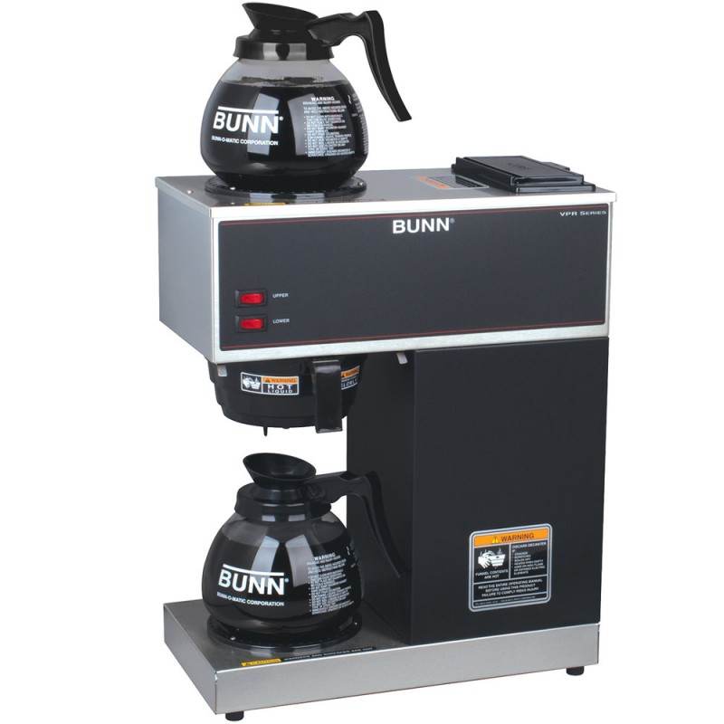 With its compact size and two independently controlled warmers, the Bunn VPR Black 12 cup pourover coffee brewer with one upper and one lower warmer is perfect for break rooms, convenience stores, coffee shops, or diners with limited countertop space.