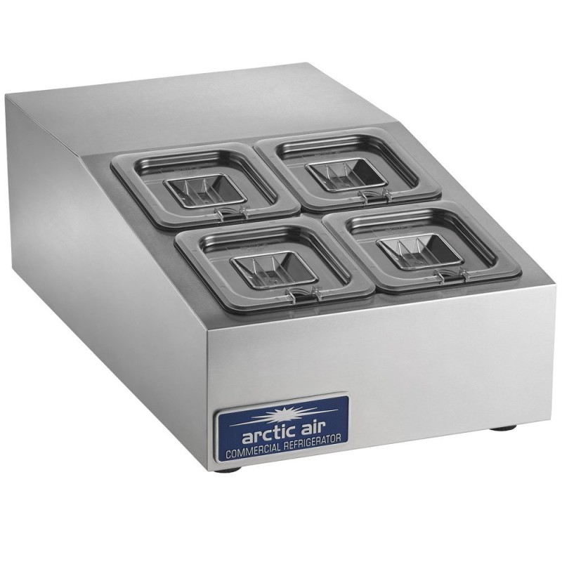 Maximize your sandwich or salad production with this Arctic Air ACP4SQ 15" countertop refrigerated prep rail! A perfect addition to your preparation area, its angled, raised rail holds four 1/6 size pans up to 6" deep in the back and 4" deep in the front. In fact, the pans and covers come included with your purchase, so you can plug the unit in and start using it right away! The compact 15" width fits easily on prep tables or countertops, providing the operator with additional toppings for subs, salads, or flatbreads.